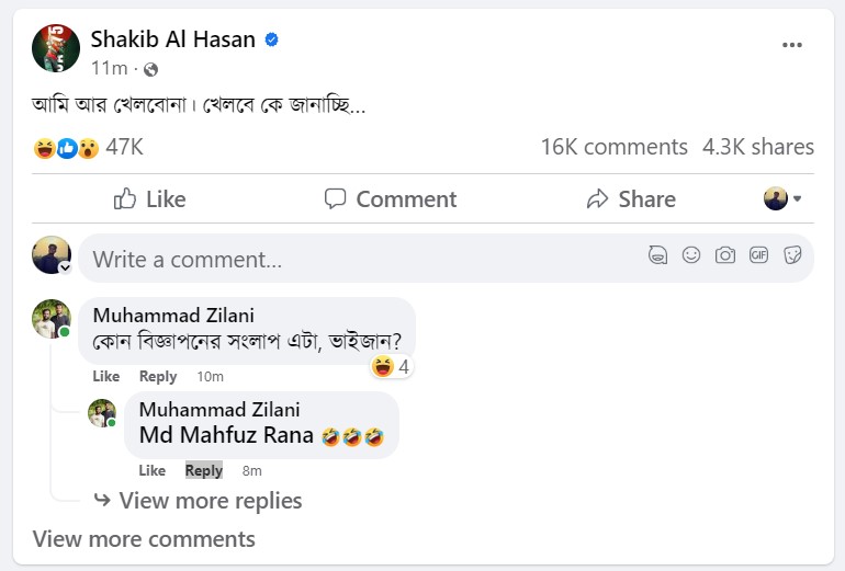 তার এই স্ট্যাটাসের কমেন্টসে অনেকেই নানান মন্তব্য করছেন। কেউ আবার মনে করছেন কোন বিজ্ঞাপনের প্রচারণাও হতে পারে। তবে এই বিষয়ে এখনই কিছু বলা যাচ্ছে না। কেন হঠাৎ এমন স্ট্যাটাস তার জন্য হয়ত আরও কিছুসময় অপেক্ষা করতে হবে ক্রিকেটপ্রেমীদের।