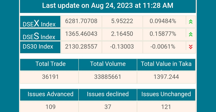 এতে এ প্রতিবেদন লেখা পর্যন্ত ১১টা ২৮ মিনিটে ডিএসইতে ১০৯টি প্রতিষ্ঠানের শেয়ার ও ইউনিট দাম বাড়ার তালিকায় রয়েছে। বিপরীতে দাম কমেছে ৩৭টির। আর ১২১টির দাম অপরিবর্তিত রয়েছে।