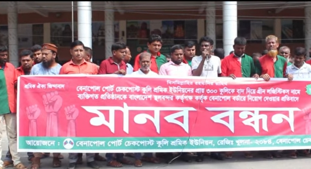 আল আমিন,বেনাপোল: বেনাপোল আন্তর্জাতিক প্যাসেঞ্জার টার্মিনালে স্থানীয় কুলি শ্রমিক ইউনিয়নের পরিবর্তে নতুন ঠিকাদারি প্রতিষ্ঠান গ্রীন লজিস্টিক-কে নিয়োগ দেওয়ার প্রতিবাদে মানববন্ধন কর্মসূচি পালন করেছে শ্রমিকরা।
