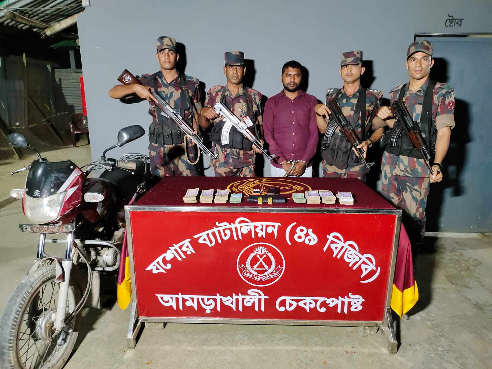 যশোর ব্যাটালিয়ন (৪৯ বিজিবি) এর অধিনায়ক জানান, স্বর্ণ, মাদক, ডলার, রুপি, হুন্ডি ও চোরাচালান মালামাল আটকের নিমিত্তে আমড়াখালী চেকপোস্টে প্রতিনিয়ত বিশেষ তল্লাশি অভিযান পরিচালনা করা হয়। এরই অংশ হিসেবে অদ্য ৩০ অক্টোবর বিকাল ৪ ঘটিকায় যশোর ব্যাটালিয়ন (৪৯ বিজিবি) এর আমড়াখালি চেকপোষ্টের বিজিবি সদস্য কর্তৃক নিয়মিত গাড়ি তল্লাশীর অংশ হিসেবে একজন মোটরসাইকেল আরোহীকে তল্লাশির সময়, উক্ত লোকের আচরণ সন্দেহজনক মনে হলে, বিজিবি সদস্য কর্তৃক উক্ত লোক এবং তার ব্যবহৃত মোটরসাইকেল বিস্তারিতভাবে তল্লাশি করা হয়। পরবর্তীতে তল্লাশীর এক পর্যায়ে উক্ত লোকের মোটরসাইকেলের সিটের ভিতরে অভিনব কায়দায় লুকিয়ে রাখা ০২ টি স্বর্ণের বার, ০২ টি মোবাইল এবং বাংলাদেশী ১২,৫৫,০০০/- টাকা উদ্ধার করা হয়।