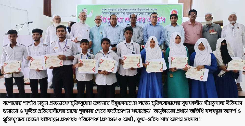 শেখ কাজিম উদ্দিন, বেনাপোল (যশোর) প্রতিনিধি : যশোরের শার্শায় নতুন প্রজন্মকে মুক্তিযুদ্ধের চেতনায় উদ্বুদ্ধকরণের লক্ষ্যে মুক্তিযোদ্ধাদের যুদ্ধকালীন বীরত্বগাথা ইতিহাস শুনানো ও কুইজ প্রতিযোগীদের মাঝে পুরস্কার বিতরণ অনুষ্ঠান অনুষ্ঠিত হয়েছে।