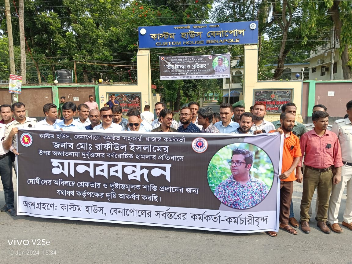 সোমবার(১০ জুন) বিকাল ৩টায় বেনাপোল কাস্টমস হাউজের সম্মুখে এই “মানববন্ধন” কর্মসুচি অনুষ্ঠিত হয়। এতে কাস্টম হাউজে কর্মরত সকল রাজস্ব কর্মকর্তা/কর্মচারী অংশ নেন। কর্মসূচি কালে নেতৃত্ব প্রদান কালে কর্মকর্তারা বলেন শুক্রবার রাতে আমাদের সহযোদ্ধা সহকারী রাজস্ব কর্মকর্তা মোঃ রাফিউল ইসলামের উপর যে বর্বরোচিত হামলা চালিয়ে গুরুতর জখম করা হয়েছে,আমরা এর তীব্র প্রতিবাদ জানায়।